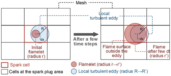 The diameter of the local turbulent eddy (equal to 2R) is equal to the turbulent integral length scale, calculated by the gas properties of the spark cell. The radius of the flamelet (equal to r) contained in the spark cell depends on the flamelet radius of the previous time step and the burning velocity [28], and is calculated by Equation (1).