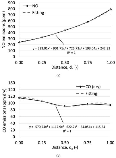 (a) NO, and (b) CO (dry) emissions for the five representative cycles with a different dn value. Their fitted correlations are also shown, together with the R2.