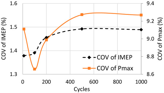 The results are processed for calculating the IMEP of each cycle, as well as the COV of IMEP of all cycles, using Equation (4). The COV of maximum pressure is given by a similar expression shown in Equation (5).