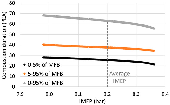 When a higher peak pressure is observed the IMEP is increased, as also highlighted previously. The previous rapidly decreases the angle of the peak pressure by almost 5° CA, shortening the combustion duration by a greater extent. This is depicted in Figure 7, where the durations for 0–5%, 5–95%, and 0–95% of mass fraction burned (MFB) are shown as a function of the IMEP, for the case with 1000 cycles with a random dn value.