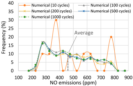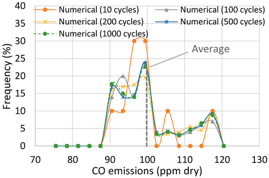 A similar analysis is provided for the CO emissions as well. Their distribution over a different number of cycles is shown in Figure 10.