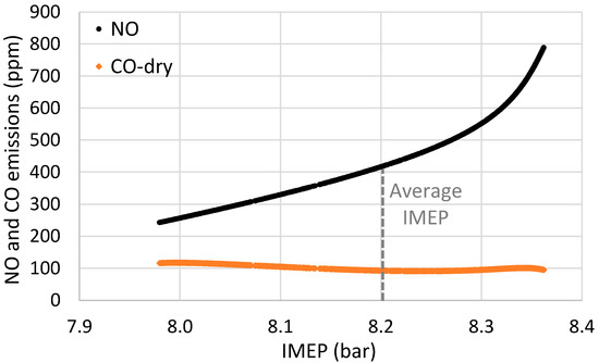 The narrow distribution observed is around the mean value of 100 ppm, almost the same as the CO emitted by the cycle with the average IMEP (equal to 91 ppm), as shown in Figure 9. Therefore, it seems that the engine cyclic variability has a small effect on CO emissions, shifting the focus on NO emissions as presented previously.
