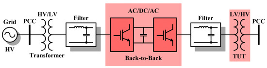 The authors in References [3,4] present a laboratory structure capable of performing tests on power transformers in conditions that are faithful to reality, which becomes a challenge when a high level of energy is required in the tests. It employs two Back-to-Back (B2B) converters whose rated power is the same power as the transformer under test, “TUT”, allowing regeneration of energy. The control is performed by the classical models that adopt proportional–integral controller (PI), and the methodology is proved by computational simulation.
