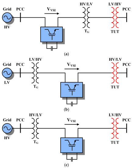 Several topologies to build the series-connected inverters are possible, depending on the available power supply. Figure 3 shows in (a) and (b) two alternatives of connection. In (c) a configuration is presented in which the converter is connected in the branch of LV. TG is a general transformer required to match voltage levels.