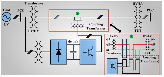 Area 1 of Figure 4 indicates through coupling transformers the series connection of the converter to the system between the TUT transformer and the transformer connected to the PCC bus. Area 2 details the effective transformers’ connection of area 1.