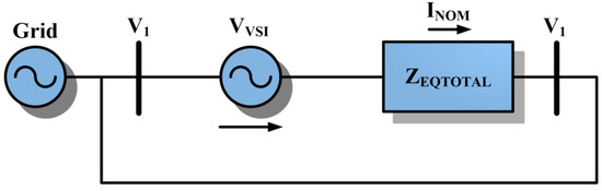 An initial estimation of the voltage value that must be introduced in series with the system might be obtained by applying Kirchhoff’s voltage law to the circuit, which can be represented as in Figure 5 considering the Figure 3b configuration.