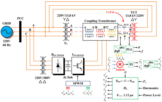 The currents of each axis are compared with the respective direct and quadrature reference currents ( and ), composed in order to, most of the time, result in the rated current of the transformer and the error is applied to a PI regulator. As the transient behavior is not being evaluated, cross-components are neglected. The output of the regulators are the reference voltages and for the controlled voltage source, being , , and obtained from the inverse Park transform of and in [25]. These reference voltages are applied to the SPWM (sinusoidal pulse width modulation) inverter for the desired voltage modulation, using here a carrier frequency of 5 kHz. The three-phase voltages are measured at the point of connection of the controlled source (PWM inverter) with the TUT and, using a Phase Locked Loop (PLL), the synchronization angle θ, as well as the frequency f of the system, is found, which reference to dq0 coordinates. The angle of fundamental va voltage was used as reference.