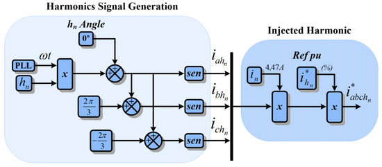 In signal generation, the harmonic order is defined in hn with angular frequency ωt obtained from the voltage PLL. Once the harmonic three-phase current signal (, , ) is established, the reference harmonic current is injected based on the nominal current in and the desired percentage whatever in pu. The generated harmonic current is applied to the control strategy block diagram, which multiplied by the inductive reactance XL results in the voltages , , and .