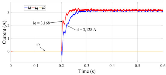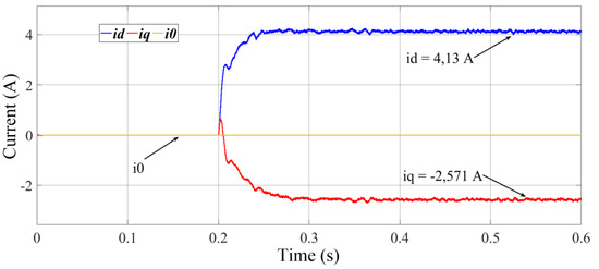 Figure 10 shows the id (4.14 A) and iq (−2.57 A) currents after 0.2 s, equal to the reference values.