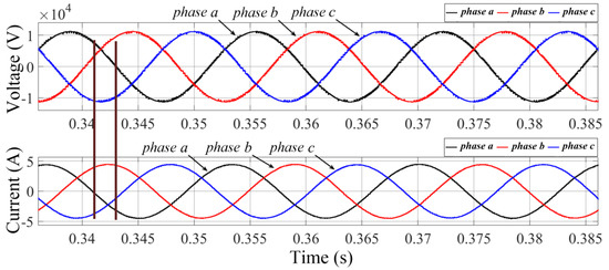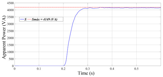 Figure 11 shows measured voltage and current at the TUT input. Two vertical lines of brown color indicate the passage of voltage and current through zero with an approximate time difference equal to 1.5 ms. By the Δt between voltage and current, the angle of 31° at phase “a” is found, confirming Fp = 0.85 inductive. This condition of overload voltage and current reached 11.5 kV and 4.88 A, respectively, exceeding the nominal values of 11.3 kV and 4.47 A. Figure 12 shows the main result of this paper, which refers to the apparent power at the inverter output of fractional value (4.1 kVA) compared to the 75 kVA of the TUT transformer. The previous work [3] used 75 kVA B2B inverter with power at least equal to the power of the TUT. This result is achieved in all simulation scenarios.