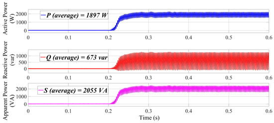 Figure 13 shows optimal result of active and reactive power supplied by the grid. The resulting apparent power from P (1.897 kW) and Q (0.673 kvar), about 2.055 kVA, demonstrates low system power consumption, which is consumed by inverter switching losses as well as system impedances.