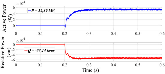 Figure 16 shows the active and reactive power circulating through the TUT after step at t = 0.2 s. The active power measured was 52.39 kW for the defined load level, close to the calculated value of 52.5 kW. The reactive power was −53.14 kvar and the calculated power was 53.5 kvar. The negative sign of Q indicates the capacitive power factor. The resulting S value was approximately 74.6 kVA, close to the nominal 75 kVA of the TUT.