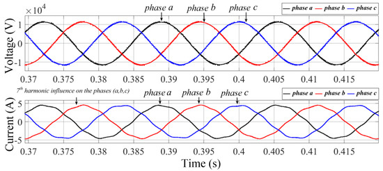 These voltages , , and are obtained by multiplying the specified harmonic current and the harmonic inductive reactance XL, as obtained applying Equations (9)–(11):