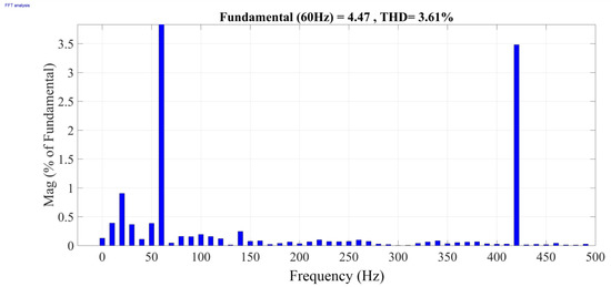Figure 18 shows the current harmonic spectrum in the TUT. It is observed that, at 420 Hz (h7), the percentage of 3.48% is in relation to the fundamental frequency (4.47 A) and Total Harmonic Distortion (THD) of 3.61%. Thus, the 3% value applied to the 7th order harmonic is confirmed.