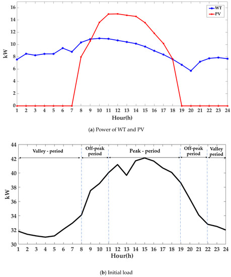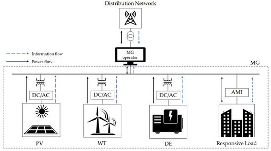 The overall structure of the proposed grid-connected MG is shown in Figure 1 and consists of a photovoltaic (PV) system, wind turbine (WT), diesel engine (DE), and load. Clearly, most of the power sources considered in the MG are micro-power sources, in other words, the aggregation of small actual entities that cover various forms of power generation such as renewable energy generation (PV system and WT) and non-renewable generation (DE). To link the renewable and non-renewable energy, several power conversion systems could be requested by the MG [23]. Although converters can be synchronized with the grid to control the grid current and maximum power tracking point, the efficiency of the converter was not considered in our work because the DC/AC or DC/DC conversion efficiency is negligible in the MG system [24]. Moreover, in the MG system, various types of customers are assumed to be linked with an advanced metering infrastructure that provides the information required from the MG operator.