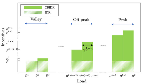 Here, ρk−1 is a function of the peak intensity, where higher incentives will be paid to the customer for load reduction during the peak period. Figure 2 compares the CBIDR and conventional IDR in terms of the incentive payment scheme. When the amount of load reduction is the same (Dk to Dk−1, Dk−n to Dk−(n−1), and D3 to D2) as xtk−n, the incentives (ρk−1, ρk−n, and ρ2 for peak, off-peak, and valley period, respectively) paid to the customers vary with the period in which the DR event occurs. As shown in Figure 2, the incentive payment ρk−1 is higher for the same load reduction when compared with the off-peak and valley periods. This concept is an advantage of the CBIDR over the general IDR, where there is no such distinction between the incentive payments over the periods. It must be improved by considering incentive payments as a function of the peak intensity. This means that customers participating in the CBIDR program will earn higher incentive payments during the peak period than during the off-peak or valley periods. Higher incentives for peak reduction can motivate customers to take part in the DR program in the peak period. To this end, the customers must be more willing to decrease their load in the peak period with respect to the conventional IDR program.