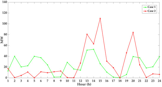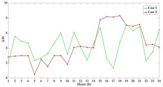 In this study, the IDR formulations (Equations (5)–(11)) were extended to more than a single time interval to incorporate them into the dynamic energy management problem. Equation (8) can be modified to adapt it to the total optimization problem horizon T instead of one time interval. Such conversion into a dynamic problem is more economical and practical in terms of solving the dynamic energy management problem. Finally, we adjusted the maximum power target for the utility benefit function f2(x) as follows: