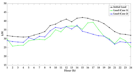 Demand-side management (DSM) [3] is a robust approach that regulates the demand of customers through various programs such as building upgrades, financial support, incentives, and behavioral changes via education. DSM can be classified into two types: energy efficiency and demand response (DR). Energy efficiency is usually considered as a perpetual load curtailment [4] whereas DR focuses on load elasticity, which can be considered as a temporary load reduction. In other words, DR encourages customers to reduce their power demand through certain incentive programs or education. DR can be further classified into price-based DR (PDR) and incentive-based DR (IDR). In PDR, consumer prices vary with the hours of operation in accordance with the supply-side cost; for example, prices are high, medium, and low for peak, off-peak, and low-peak periods, respectively [5]. IDR is a program in which participating consumers are awarded incentives according to the amount of power curtailed; this can be classified into four types: direct load control, load curtailment, demand bidding, and emergency demand reduction [6]. Recent years have witnessed an increase in the use of microgrids (MGs). Many researchers have employed MGs to test the DR performance in terms of how it can resolve the power supply uncertainty as well as economic and environmental problems [7,8,9]. A MG can be defined as a small-scale distribution network comprised of various renewable energy systems (RES) such as photovoltaic (PV) systems and wind turbines (WTs) as well as conventional generators such as thermal generators and diesel engines (DEs), energy storage systems (ESSs), and fuel cells. In general, it can be connected with the main grid to exchange power, or it can operate in an island mode in emergencies or remote locations [10].