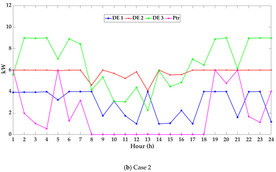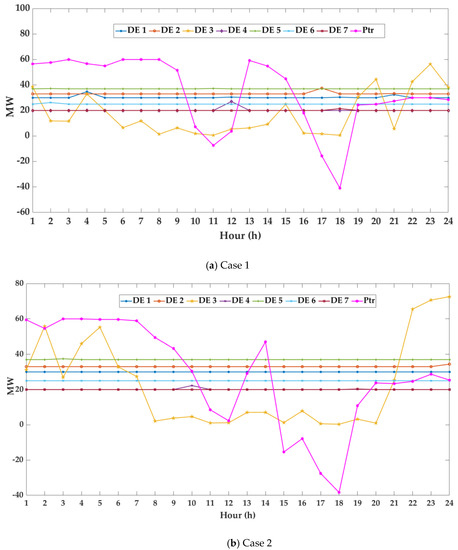 The total power generation from the DE, WT, and PV and transferred power from or to the main grid should match the load.