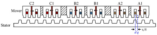 The studied PPMLM is composed of a primary mover and secondary stator as illustrated in Figure 1. Both the permanent-magnets and armature windings are equipped in movers. As is shown in Figure 1, the middle of stator teeth is defined as the d-axis with the maximum PM flux linkage. Meanwhile, the primary position is defined as the q-axis where PM flux linkage is minimum (zero). τs is the stator pole pitch, and the distance between two axes is τs/4. When the positive permanent-magnet flux linkage in phase-A winding is maximum, the corresponding primary position θe is defined as zero.