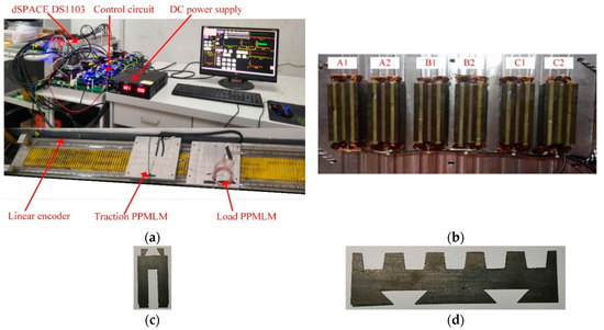 To verify the effectiveness of the proposed MPCC, the hardware should be able to measure the dc bus voltage, two phase currents and the primary position. There was no special requirement for the software. According to the hardware/software requirements, a test bench was designed as illustrated in Figure 6, and the parameters of the studied PPMLM are listed in Table 3. A dSPACE DS1103 controller was adopted to execute the control algorithm. DC bus voltage was measured by a voltage sensor (LEM LV25-P, LEM, Geneva, Switzerland). Phase currents are sensed by two current sensors (LEM LA55-P/SP50, LEM, Geneva, Switzerland). The primary position was detected by the linear encoder. The VSI was manufactured by Infineon, and its switch states were determined by the dSPACE DS1103 controller. The sampling frequency was 20 kHz. To compare the two MPCCs, several experiments were carried out.