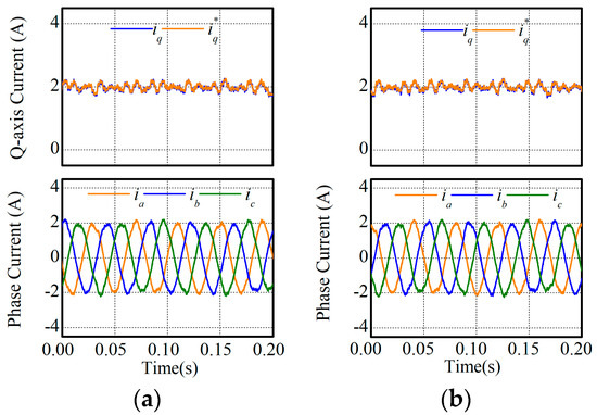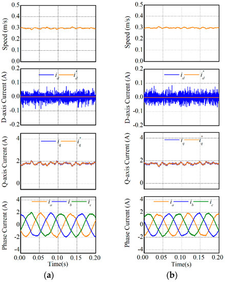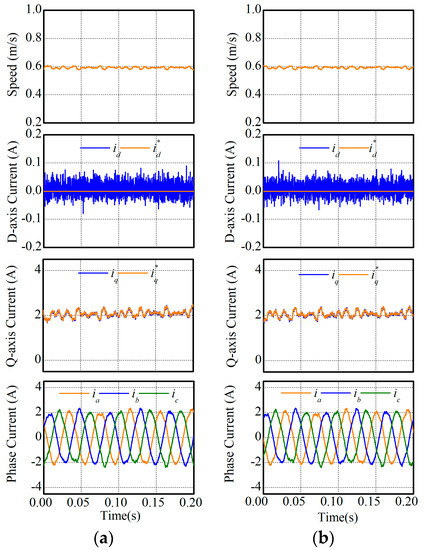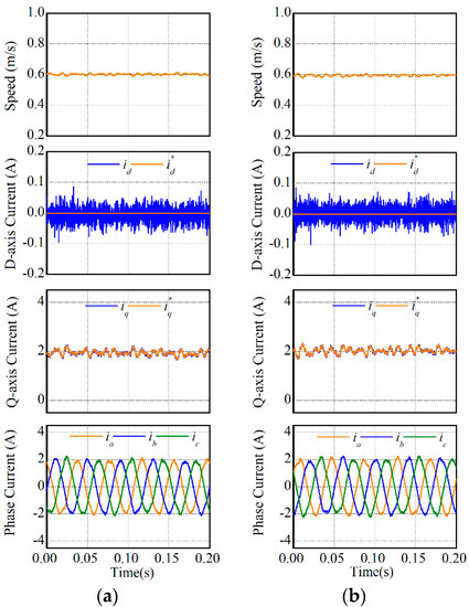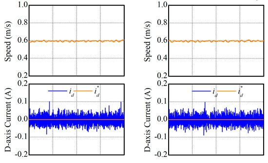 In this experiment, the steady-state performances of two MPCCs were compared. The reference speed was respectively set as 0.3 m/s and 0.6 m/s, and experimental results are respectively illustrated in Figure 7 and Figure 8. According to the experimental results, speed, synchronous currents, and phase currents were compared in Table 4. It can be found in Table 4 that MPCC-I and MPCC-II had nearly the same performance regarding speed, synchronous currents, and phase currents.