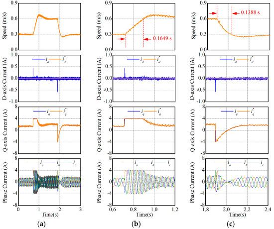 Speed response performances of MPCC-II. (a) t = 0–3 s, (b) t = 0.6–1.2 s, and (c) t = 1.8–2.4 s.