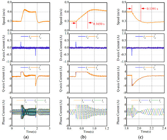 Speed response performances of MPCC-I. (a) t = 0–3 s, (b) t = 0.6–1.2 s, and (c) t = 1.8–2.4 s.