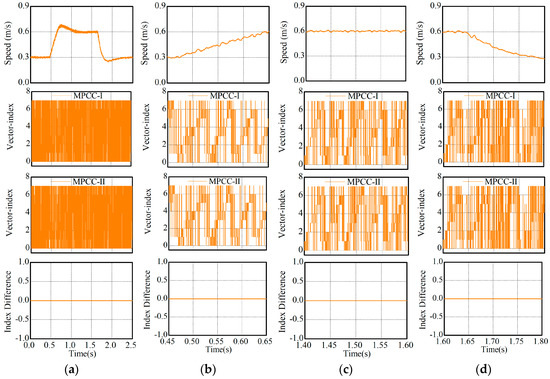 Both MPCCs run at the same time in this experiment but only the command signals of MPCC-II were implemented by the VSI. In other words, the command signals of MPCC-I were generated only for comparison instead of implementation. The reference speed was changed between 0.3 m/s and 0.6 m/s. Experimental results are illustrated in Figure 12, in which the numbers 0–7 respectively represent U0–U7. It can be found in Figure 12 that both MPCCs always selected the same VV no matter in transient- or steady-state operations. Therefore, the equivalence of both MPCC was well verified.