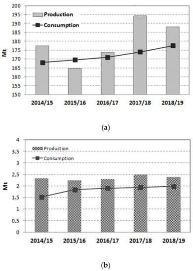 Figure 1. Sugar production and consumption worldwide (a) and in Colombia (b) [1].