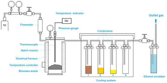 All pyrolysis tests were carried out in a batch scale reactor unit. The laboratory-scale pyrolysis unit (Figure 4) consists of a stainless steel reactor with 50 mm internal diameter and 300 mm length, a cooling unit formed by four condensers, and a gas scrubber to retain any other volatile organic compounds that did not condense in the cooling system. While the first two condensers are at room temperature (first condenser to retain any biomass particles that might be driven by gas flow, second condenser to trap the heaviest fraction), the third condenser is cooled with ice, and the fourth condenser is cooled with liquid nitrogen. The reactor is heated inside an electrical furnace fitted with a thermocouple and a temperature controller. For all experiments, 50 g of each biomass sample was loaded directly in the reactor. The loaded reactor was sealed and placed inside the electrical furnace. The reactor was externally heated from room temperature to 450 °C at a heating rate of 7–8 °C/min. When the temperature reached 100 °C, nitrogen flowing at a rate of 50 L/h was injected through the reactor. The pyrolysis tests were performed at 450 °C for 2 h to ensure maximum conversion of biomass waste particles. Afterward, the reactor was cooled down to 100 °C under a nitrogen flow of 50 L/h and then it was allowed to reach room temperature overnight. During pyrolysis and cooling of the reactor, the liquid fraction was collected in condensers. After cooling, the reactor was removed from the electrical furnace.