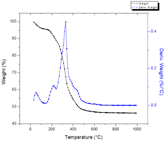 The thermal behavior of the press mud is shown in Figure 5, which shows the mass loss (TGA) and derivative mass loss (DTA) profiles as a function of temperature, within the temperature range of 25–1000°C. From this figure, the mass loss of press mud can be divided into four phases: the first phase, 25 °C to 150 °C, was attributed to the elimination of the free and bound moisture present in the material [24]. Then, during the second step, a significant loss of the mass (~32%) was observed ranging from 150 °C to 350 °C. In this range, the derivative thermogravimetry (DTG) curve shows a peak at 310 °C. This behavior is the result of the decomposition of hemicellulose and cellulose [26]. Afterward, lignin decomposition occurred in the 350–470 °C range with a mass loss of ~13%. In the last phase, the slope presented small variations corresponding to the degradation of oxygenated compounds that are stable at a high temperature. The residue of the sample is left as char.
