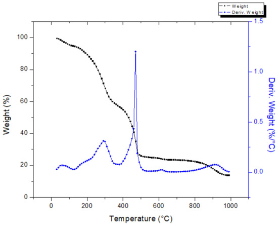 The thermogravimetric analysis of vinasse powder is presented in Figure 6. The overall mass loss of vinasse can be divided into five phases. The first phase corresponds to the removal of free moisture, bond moisture, and evaporation of volatile matter in the range of 25–100 °C and 100–200 °C, respectively. In the second phase, there occurs the main volatilization, and a mass loss of ~30% is achieved. Then, a mass loss of ~5%, followed by a weight loss of 30% with a decomposition peak temperature at 475 °C, can be seen in the range of 400–475 °C. Finally, no mass loss was detected up to 1000 °C. Vinasse decomposed at higher temperature than the press mud.