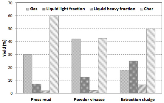 Figure 8 presents the difference in pyrolysis products yield when each type of biomass waste—press mud, powder vinasse, and extraction sludge—was used as feedstock for slow pyrolysis. The liquid product was divided into heavy fraction and water (collected in the first two condensers of the pyrolysis unit) and light fraction (collected in the other two condensers). The gas yield was calculated as the mass difference between feedstock, liquid, and char yields.