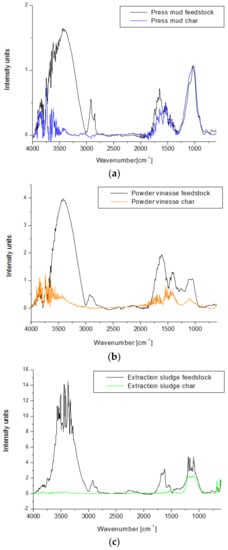 Significant changes of FTIR spectra appear in the case of all bio-char samples obtained after slow pyrolysis at 450 °C for 2 h. The OH stretching band from 3750–3970 cm−1 decreased drastically in the case of all char samples, disappearing completely in the case of char from extraction sludge (with the lowest content of lignin of 12.7%). The absence of a peak at the 2920–2930 cm−1 range suggests a significant decomposition of the biomass material during pyrolysis [47]. While the bio-char produced from press mud still shows the peaks characteristic to C–O stretching at almost the same intensity as the feedstock, the other two char samples show a significant decrease of the peaks from this region, suggesting the higher degradation of the organic compounds for these two biomass samples.