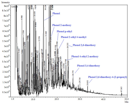 The pyrolysis liquid from the powder vinasse still contained a significant amount of phenolic compounds (18.9%), in particular, phenol, phenol methoxy, phenol methyl, and ethyl. Figure 10 shows the chromatogram of the pyrolysis liquid obtained from powder vinasse with the identification of the peaks characteristic to phenols. This sample contained a higher content of aliphatic and aromatic ketones (19.2%) compared with the other two pyrolysis oils generated from the press mud and the extraction sludge. Moreover, the sample also showed the presence of alkynes and sulfur organic compounds; the powder vinasse presented the highest content of sulfur—1.47%. The extraction sludge showed significant amounts of toluene, xylenes, and benzenes (37.3%), as well as aliphatic and aromatic ketones (6%), alkanes, and alkenes (13.7%).