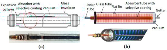 Cross-section of evacuated tube receiver with: (a) CT absorber with flat fins and (b) SFT absorber.