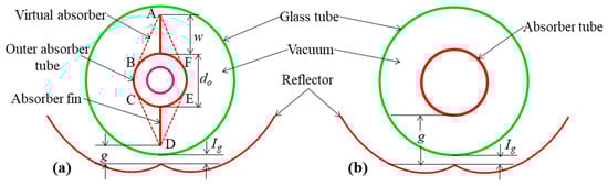 Virtual absorbers of concentric tube receiver: (a) virtual absorber enclosing the CT absorber with flat fins only; (b) virtual receiver enclosing CT absorber with flat fins and gap between fin and reflector cusp.