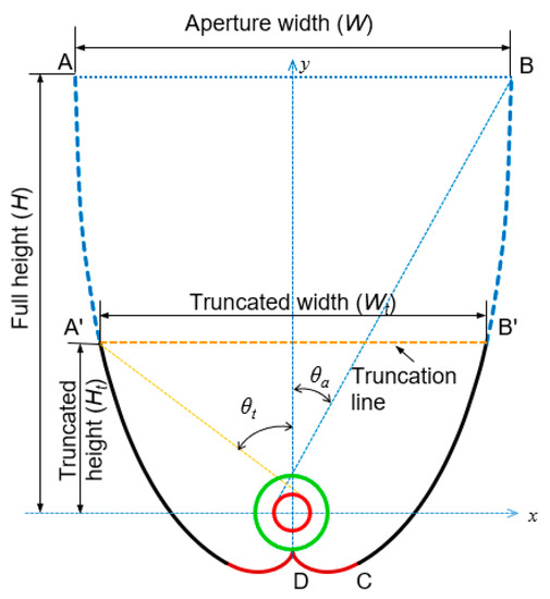 The reflector height of a CPC is very large, especially with small acceptance angles which leads to high material and manufacturing cost. However, upper portions of reflectors become almost parallel to the axis of CPC and contribute very little in the enhancement of radiation concentration. Therefore, the top portions of the reflector were truncated to save a significant amount of material and manufacturing cost with a small decrease in the aperture width and concentration ratio (CR), as shown in Figure 4.