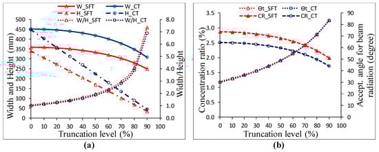 Effect of reflector truncation on: (a) aperture width, reflector height and width/height ratio; (b) CR and acceptance angle for beam radiation (θt).
