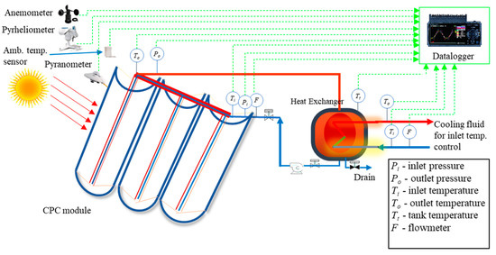 The 60% truncated CPC paired with CT receiver, which emerged as the best choice among all configurations, was selected for experimental testing. CPC troughs were fabricated using highly reflecting Alanod sheets as the concentrators and assembled with CT receivers. The whole CPC module was installed on the base frame along with all measuring instruments as per the schematic diagram shown in Figure 6. The location of measuring instruments is also illustrated in the schematic diagram. PT-100 was used to measure the temperature at designated places. The flow rate of the HTF (Therminol-55 oil) was measured by Oval Flowpet-5G flowmeter. A first-class pyranometer (EKO MS-402) mounted on the main frame of the collector was used to measure the global solar radiations in the plane of the collector’s aperture while pyrheliometer (EKO MS-56) installed on sun-tracking platform (STR-21G), was used to measure the direct solar radiations. The wind velocity was measured by using an anemometer (Adafruit, New York, NY, USA).