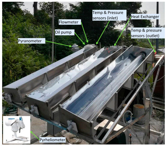 The experimental test rig was installed at the test site of the Solar Thermal Advanced Research Center (STARC), Universiti Teknologi PETRONAS, Malaysia (latitude 4.385 °N, longitude 100.979 °E). The test rig was flexible enough to be oriented in any direction and tilting of troughs along their longitudinal axes. The whole system shown in Figure 7 was tested under actual outdoor environmental conditions for both N-S and E-W arrangements following the guidelines provided in ISO9806-2017 standard for testing solar thermal collectors.