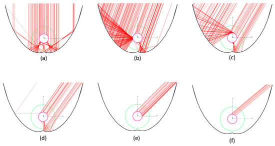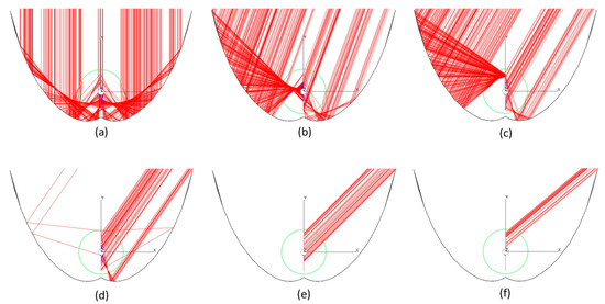 Ray tracing diagrams in case of 60% truncated CPC coupled with CT receiver for different incidence angles: (a) 0°; (b) 20°; (c) 30°; (d) 35°; (e) 45°; (f) 50°.