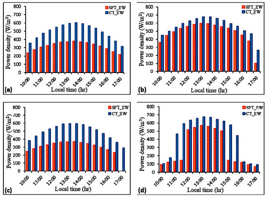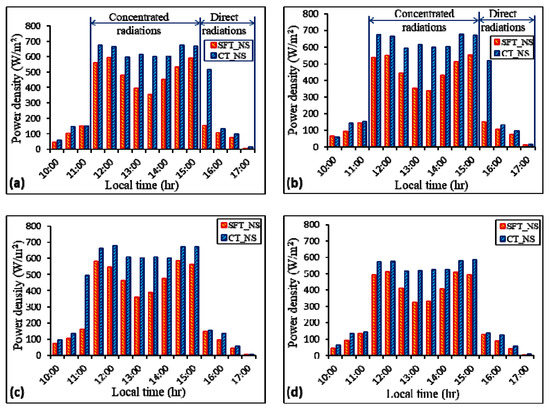The stationary installation of truncated CPC coupled with SFT receiver in N-S direction achieved the maximum power density at spring and autumn equinoxes (about 600 W/m2) which reduced to 550 W/m2 and 510 W/m2 at the summer and winter solstice, respectively, as shown in Figure 10a–d.