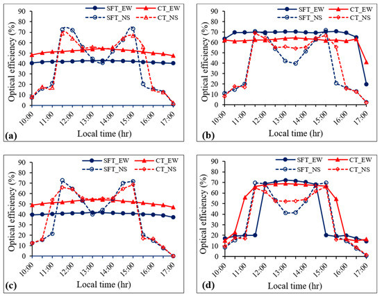 The optical efficiency of 60% truncated CPC collector integrated with SFT and CT receiver at: (a) spring equinox; (b) summer solstice; (c) autumn equinox; (d) winter solstice.
