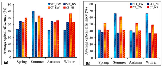 Optical simulations were run for both CPC collectors to evaluate the performance under different arrangements. Optical efficiency defined by the ratio of the power available at the outer surface of the absorber to that incident at the inlet aperture of the collector was determined for the concentration-time period (4 h) as well as for the overall effective operating time period (7 h). The optical efficiencies showed similar trends to power collection under different configurations. A significant reduction in the optical efficiency of CPC paired with SFT receiver was observed for incidence angles approaching the minimum value (at midday), predominantly due to higher gap losses as shown in Figure 12a–d. The reduction in optical efficiency at noontime was avoided by employing a CT receiver, especially in the N-S orientation.