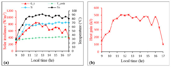 The outlet temperature of HTF dropped after about 13:30 h in case of N-S installation due to fast decrease in solar irradiance as can be seen in Figure 15a. The heat gained by the circulating fluid was also determined at average mass flow rate of 156 kg/h which is equivalent to 0.02 kg/s-m2 as per ISO9806 standard of testing solar collectors. The heat gain followed trends almost similar to the incident solar irradiance.