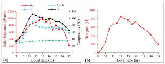 Experimental results of CPC collector with CT receiver: (a) solar irradiance and temperatures and (b) heat gain for N-S installation recorded on 26th Apr 2019.