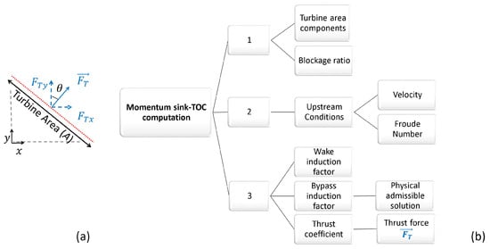 Two-dimensional representation of the thrust force () exerted by the turbine to the incident tidal-stream (a) and the momentum sink turbine operating conditions (TOC) computation procedure (b).