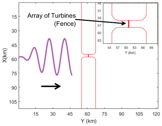 Turbine configurations were deployed in the middle of the channel (Figure 2). The fence corresponds to an array of turbines distributed as a single row that fully extends across the channel cross-section. On the other hand, the partial fence covers 40% of channel cross-section; the length of the array is 1200 m defined over eight grid-cells, where each grid-cell contains a cluster of turbines.